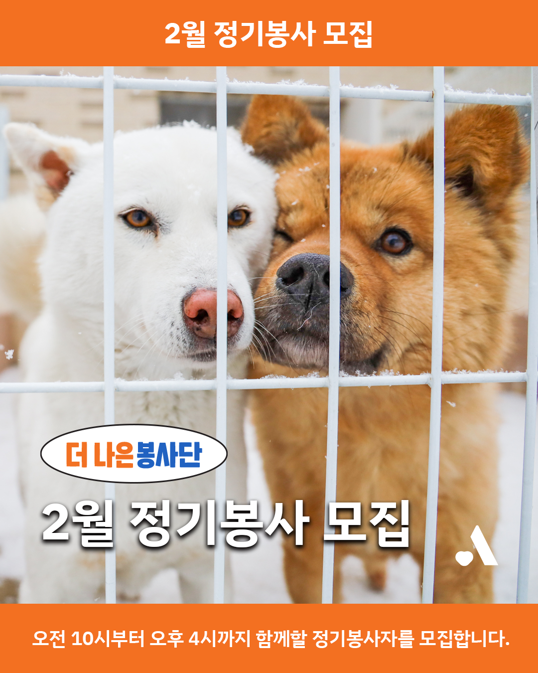 ’더 나은 봉사단‘은 온센터 보호 동물들의 더 나은 삶을 위한 활동을 합니다. 환경 개선, 놀이 활동, 교감을 통해 동물들의 삶을 바꾸어 나갑니다. 2026년 2월 한 달 동안 온센터 동물들과 함께 시간을 보내주세요!