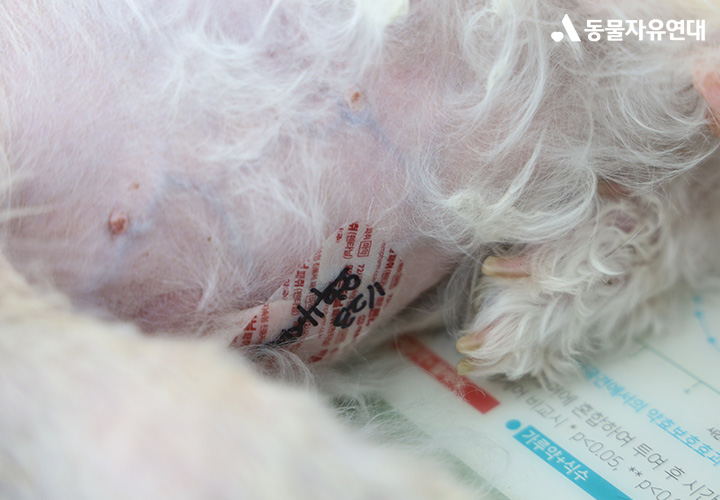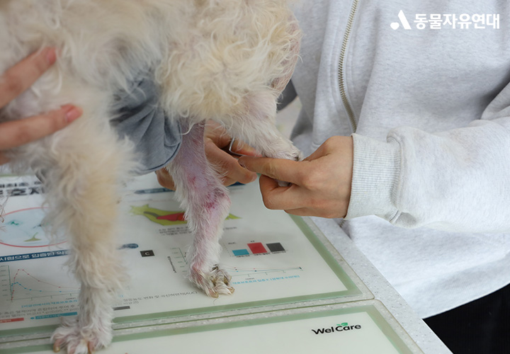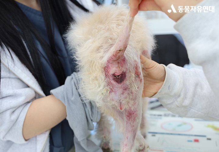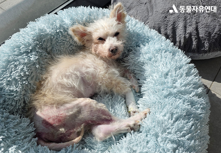 종양의 영향으로 허브의 뒷다리 감각이 많이 저하된 상태입니다. 항문 부위에는 부종이 나타나고 있습니다. 허브의 현재 상태와 종양의 위치, 진행 정도를 고려했을 때 방사선 치료를 시행하더라도 기대할 수 있는 효과가 크지 않을 수 있다는 소견을 받았습니다. 현재는 마약성 진통 패치를 부착해 통증을 조절하고 있으며, 허브의 상태에 맞춰 곁에서 세심하게 살피고 있습니다.