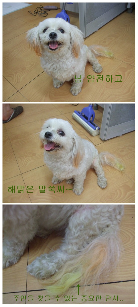 염색의 흔적은 오래되었지만, 미용이 잘 되어있고 살이 통통하게 찐 점으로 보았을 때 얼마 전까지 개를 키우던 주인이 있었을 것으로 짐작되었으나, 돌덩어리처럼 딱딱하게 뭉쳐있는 꼬리털, 새카맣게 썩어들어가는 귓구멍 등을 보면 꽤 오랫동안 떠돌이 생활을 했던 것으로 추정되기도 합니다.