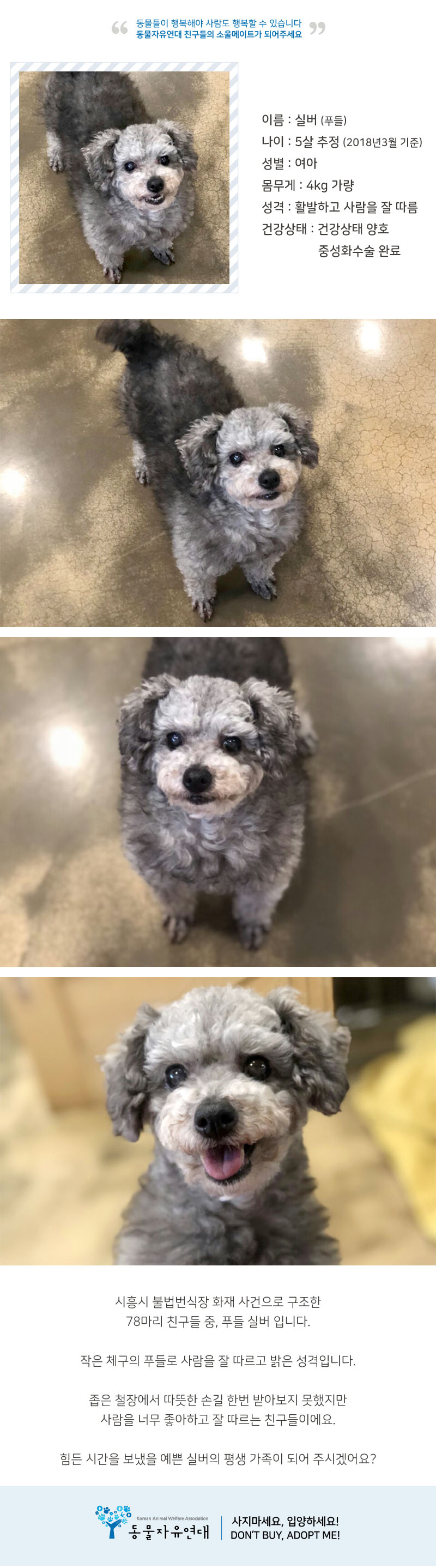 안녕하세요. 전형순님 동물자유연대입니다. 실버는 저번주에 진행했던 입양캠페인 행사에서 입양가족이 결정되었습니다. 다른 아이들에게도 많은 관심 부탁드립니다. 감사합니다^^