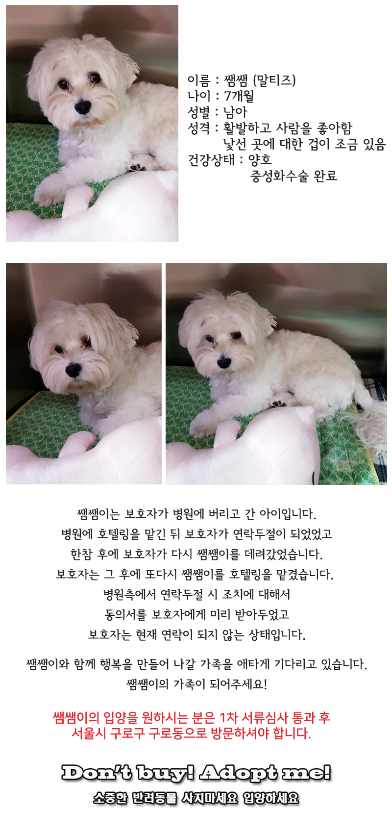 쌤쌤이는 비숑프리제 같아 보이는데요. 말티즈는 아니고요, 똑똑하고 털이 안 빠지는 영리한 견중이랍니다!