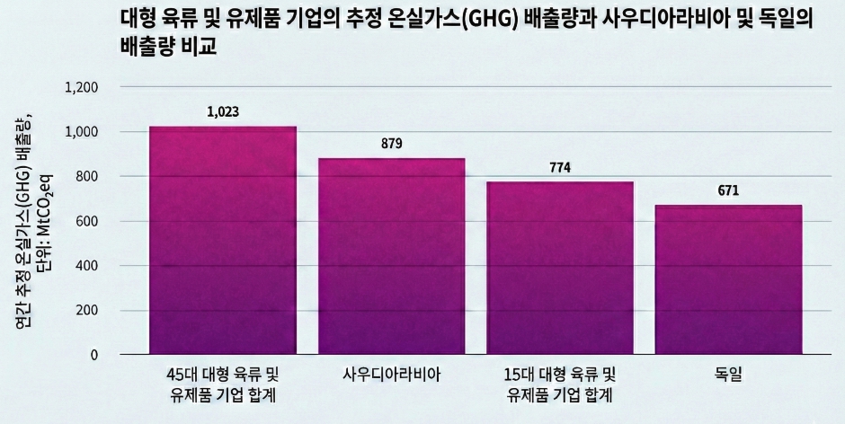 Marfrig, Tyson, Minerva, Cargill)의 배출량 합계(4.8억 톤)는 거대 석유 기업인 엑슨모빌, 쉘,
