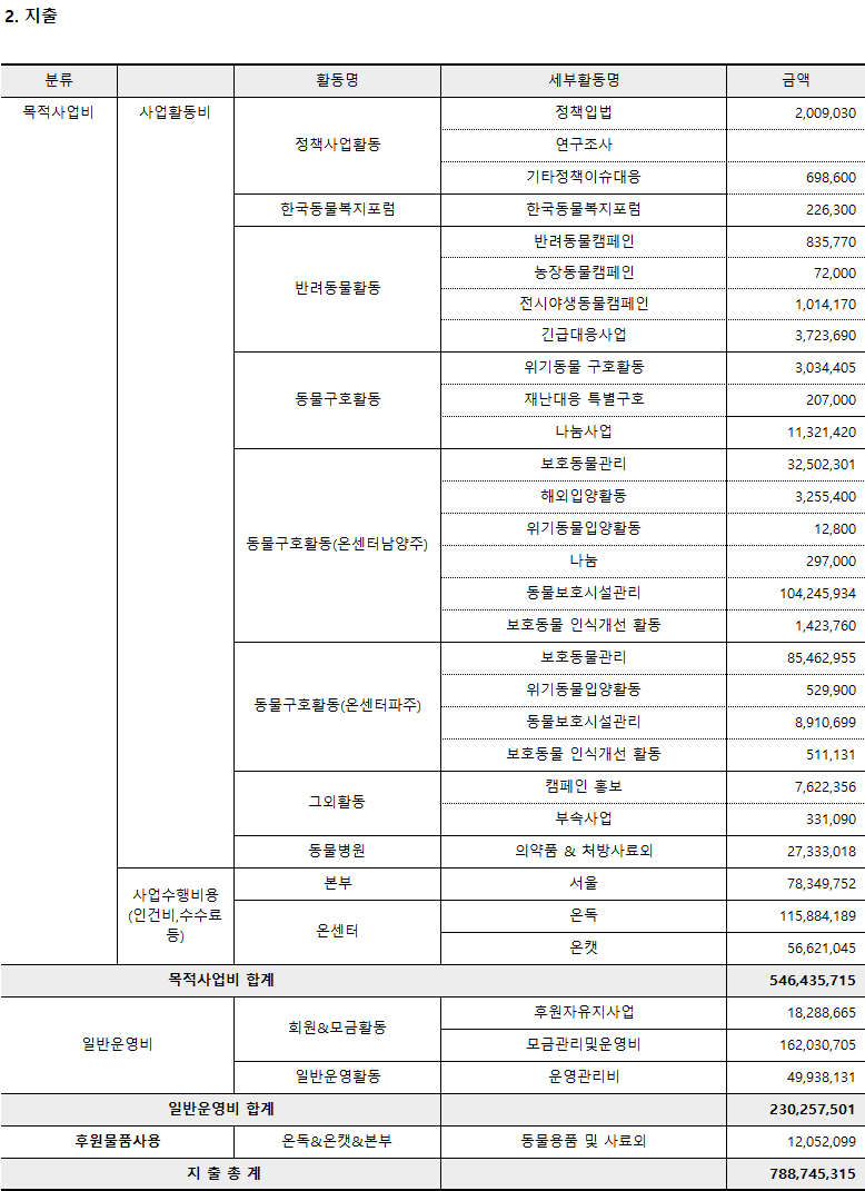 * 동물자유연대는 2013년부터 외부 회계감사를 시행하고 있으며, 모든 개별 후원 내역을 매월 투명하게 공개하고 있습니다. (첨부 파일의 개별 후원 내역은 성함의 ㄱ,ㄴ,ㄷ 등 자음 순으로 순으로 기록되었으며, 특수문자 및 영어로 시작하는 이름은 "ㄱ"에 포함돼 있습니다.) * 동물자유연대는 2013년 국내 최초의 동물복지형 보호시설 '온센터'를 개소하고 한국 동물 보호 시설의 표준을 제시해왔습니다. 2022년에는 고양이 전문 보호소인 '온캣'을 건립, 개와 고양이를 분리하여 종 특성에 맞는 국내 최고의 맞춤 돌봄을 제공하고 있습니다. * 후원금은 위기동물 구조 및 보호, 입양 사업부터 동물복지 증진을 위한 정책, 교육, 캠페인 사업 등 다양한 활동 영역에서 사용됩니다. * 상기 내용은 연간 결산 시 일부 조정될 수 있습니다.