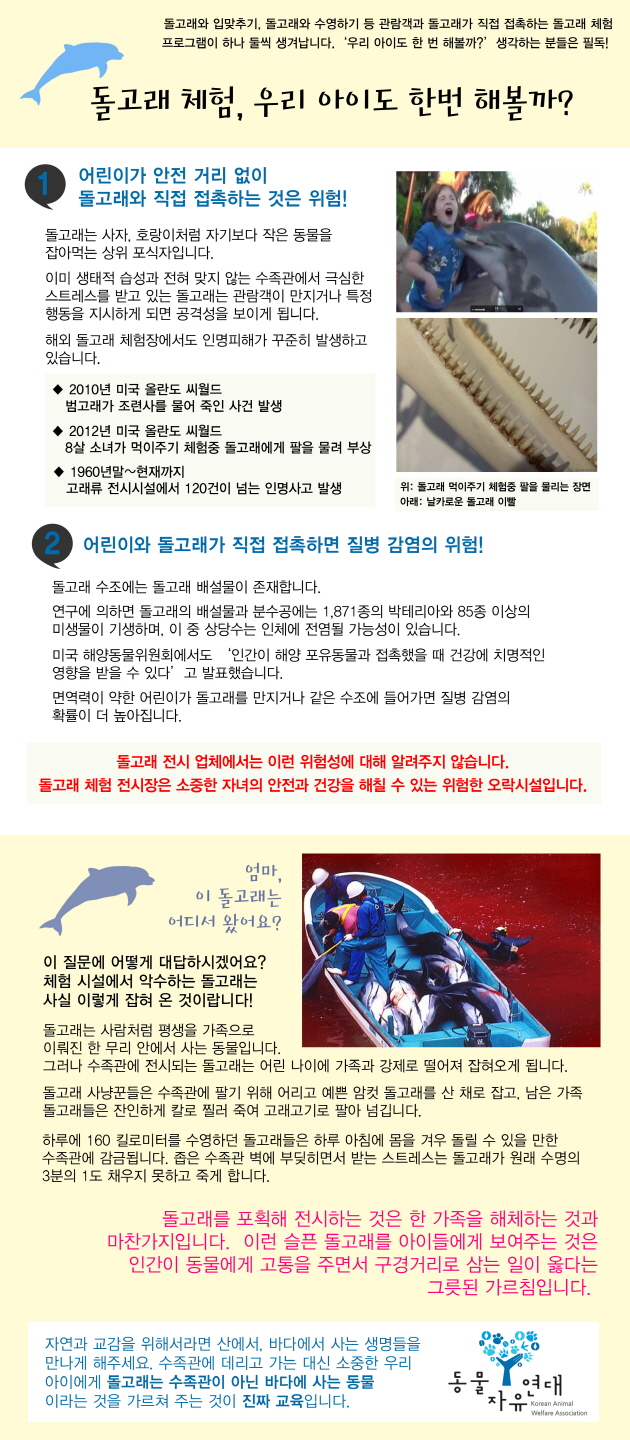 동물자유연대 홍보물을 이용해 돌고래 체험의 위험성에 대해 널리 알려주세요!