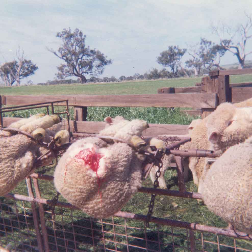 양털 최대 생산국가인 호주에서는 많은 양털을 메리노라는 품종의 양을 많이 사육하는데 그들은 털로 꽉 덮여있는 주름진 피부에 습기가 차고 파리가 알을 까 구더기로 고통 받게 됩니다. 그래서 양털 생산자들은 이를 예방하기 위해 뮬레징(mulesing)이라는 방법을 고안하였는데 뮬레징은 아무런 마취도 하지 않은 채 양들의 꼬리 부분의 생살을 도려내는 방법입니다.