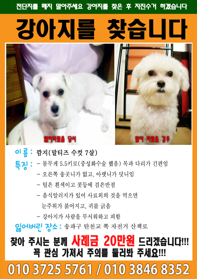 말티즈수컷 몸무게5키로 중성화된 깜지 찾습니다
