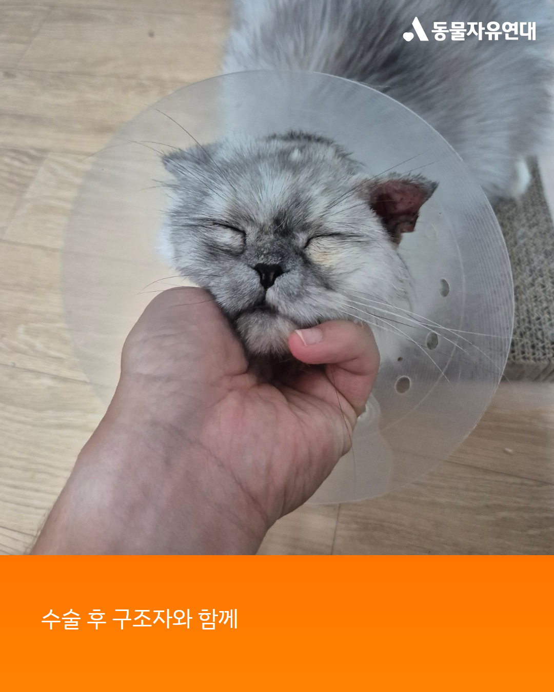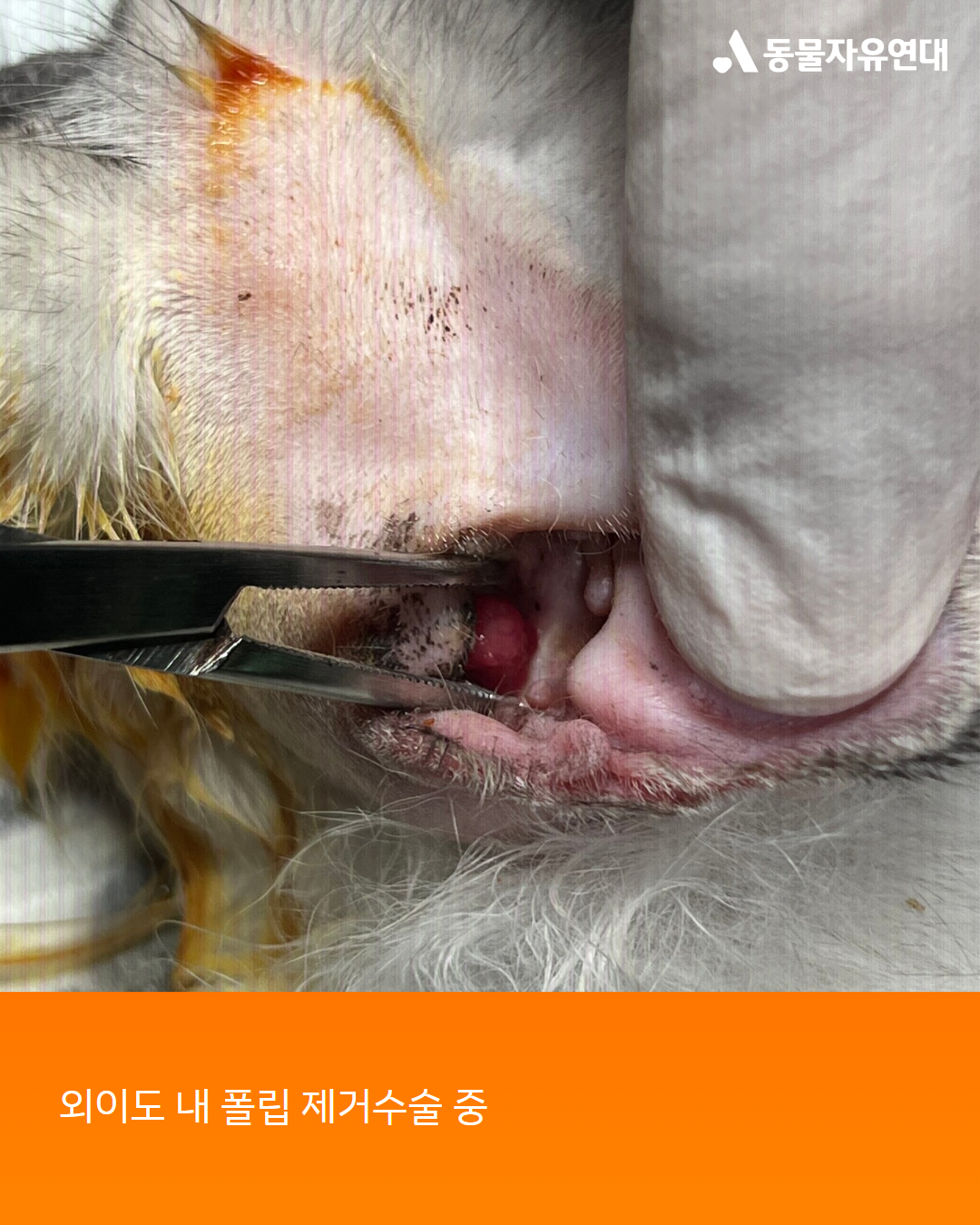 처음 방문한 병원에서 혈액검사, 방사선검사, 검이경 검사 등을 진행했는데, 좀 더 정확한 진단을 위해 더 큰 동물병원으로 가 CT 촬영을 했습니다. 검사 결과 ‘외이도 내 폴립’으로 확진되었습니다. 처음 병원에서는 TECA(전이도 적출술)을 권유했습니다. TECA는 고양이에게 쉽지 않고, 청력상실, 안면신경 손상 등 부작용의 가능성이 있어서 구조자는 광복이의 안전을 위해 수술 경험이 풍부한 병원에서 수술을 하고 싶었습니다.