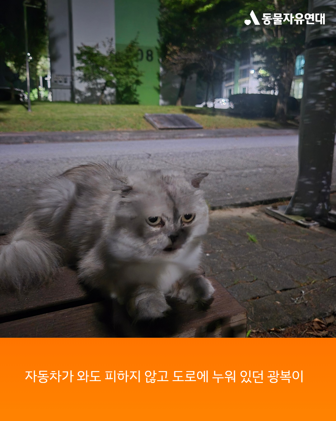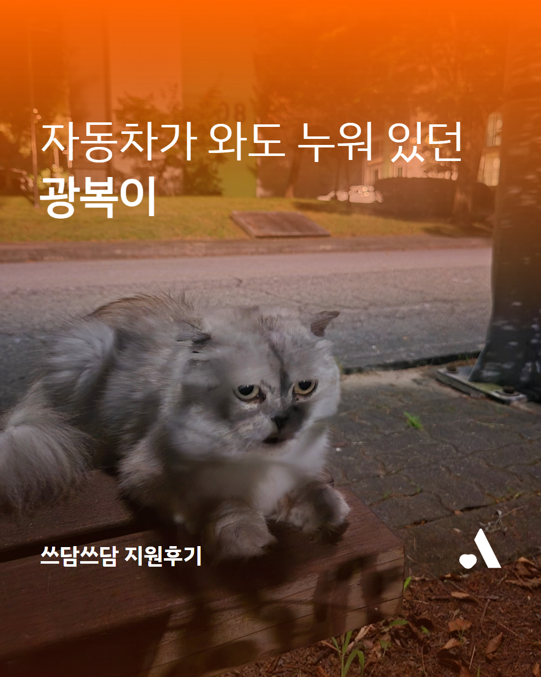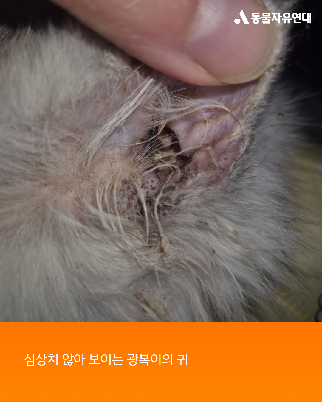 아파트 단지 내에서 운전하는 중에 도로 가운데 고양이 한 마리가 누워 있었습니다. 차가 가까이 가도 비키지 않아 주차 후 다가가니 경계심 없이 애교를 부렸습니다. 급히 편의점에서 캔을 사서 먹였습니다. 이상하게 발이 잘 떨어지지 않아 ‘집까지 따라오면 거둬야지.’라는 마음으로 평소와 달리 고양이에게 돌아갔고, 고양이는 구조자를 따라 5층까지 따라왔습니다. 이 모습에 구조자는 운명 같은 인연이라 느껴 고양이를 가족으로 맞이했습니다. 이름은 ‘광복이’라고 지었습니다. 다음날 병원에서 기본 검진을 받아보니 ‘외이도 내 폴립’이라는 병을 앓고 있다는 것을 알게 되었습니다.