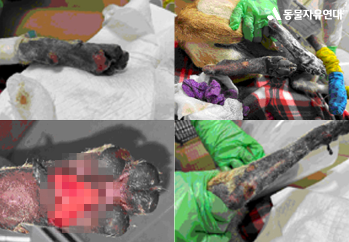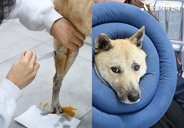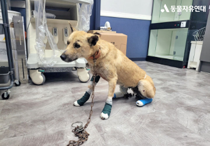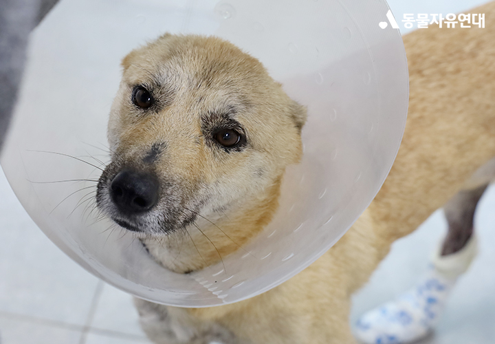 사뿐이는 발바닥 패드와 다리 피부가 크게 까지고 찢겨, 한동안 네 발에 모두 붕대를 감고 지내야 했습니다. 상처를 소독할 때마다 쓰라린 고통이 있을 텐데도 사뿐이는 그저 가만히 활동가의 품에 안겨 있었습니다.