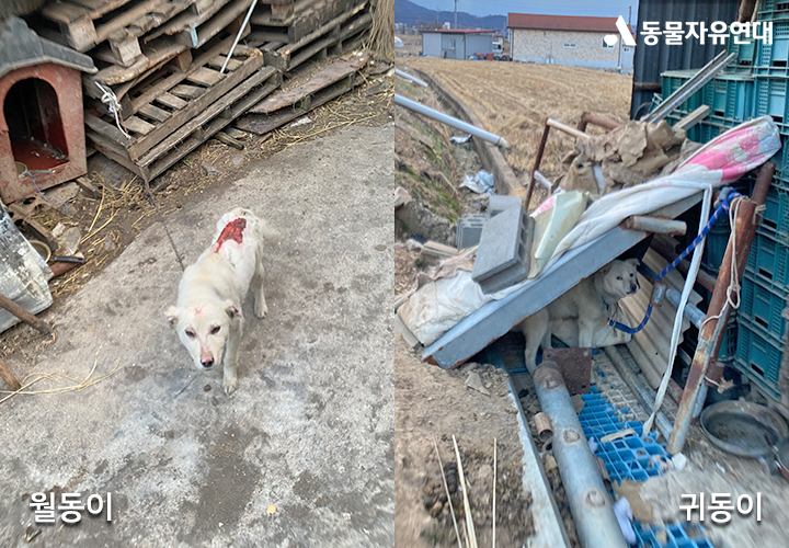 제보를 받고 도착한 현장은 여전히 잿더미와 그을음이 남아 있었습니다. 불에 탄 적재물 사이, 좁은 개집 하나가 눈에 들어왔습니다. 그곳에는 1미터도 되지 않는 짧은 줄에 묶인 채, 몸을 제대로 움직이지 못하는 월동이와 귀동이가 있었습니다. 두 친구 모두 몸 곳곳 화상으로 손상돼 있었습니다. 등과 얼굴에는 피부가 벗겨진 자국이 선명했고, 움직일 때마다 아픔이 느껴지는 듯 보였습니다. 그런데도 사람의 기척을 느끼자 꼬리를 흔들며 다가오려 했습니다.