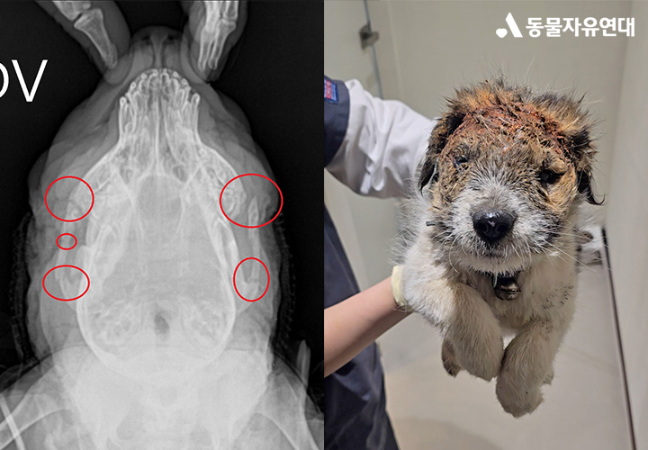 세온이는 양측 광대부를 포함한 안면부 다발성 골절과 심각한 염증을 동반한 상태로 구조되었습니다. 무거운 쇠사슬에 묶인 채 몸을 제대로 움직일 수도 없었고, 얼굴은 심하게 부어 있었으며 곳곳에 염증이 가득 차 있었습니다. 검진 결과, 세온이는 양쪽 광대뼈가 모두 골절된 상태였습니다.