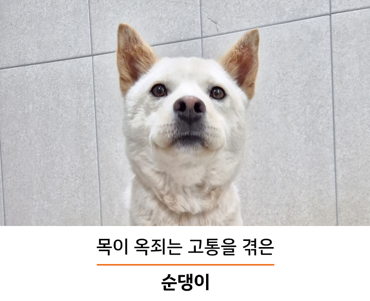 순댕이는 장흥군의 길 위에서 발견되었습니다. 목에는 오래된 목줄이 깊게 파고들어 있었고, 그 상처는 단순한 외상이 아니라 오랜 시간의 고통을 증명하듯 심각한 상태였습니다. 몸을 움직일 때마다 목이 졸렸을 것이고, 숨을 쉬는 일조차 편하지 않았을 것입니다. 길 위를 떠돌며, 언제 달려올지 모르는 차량과 사람 사이에서 순댕이는 매 순간이 위기인 삶을 견뎌야 했습니다.