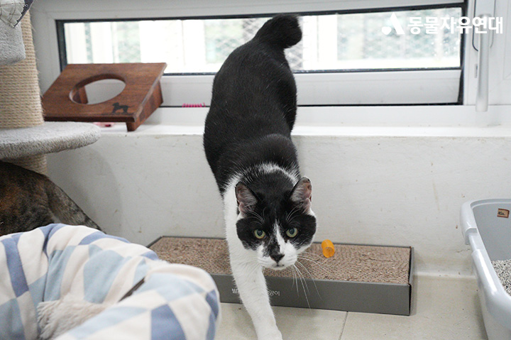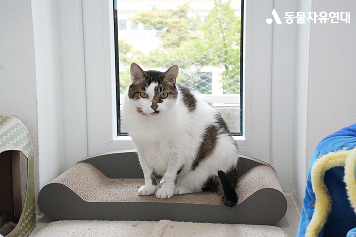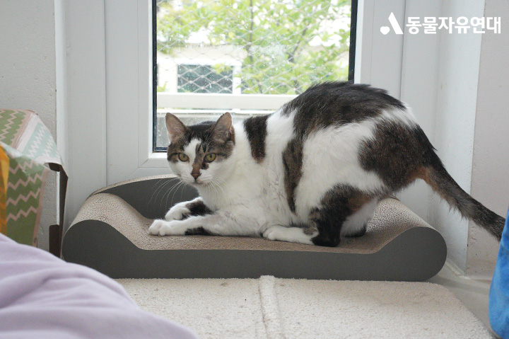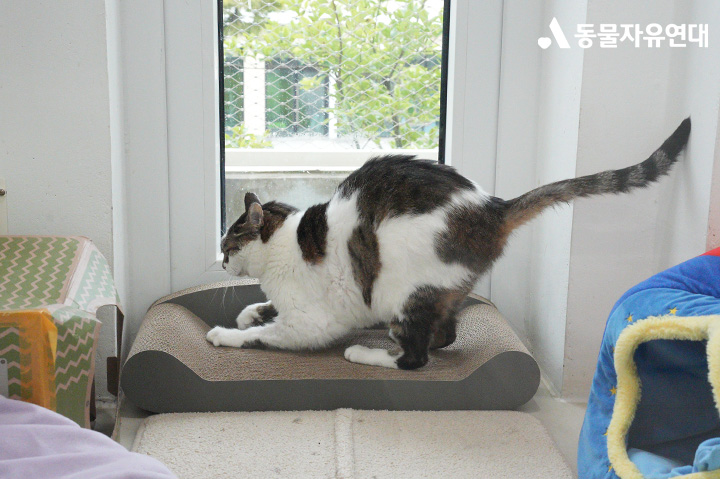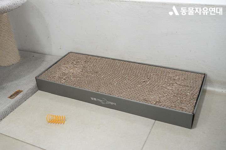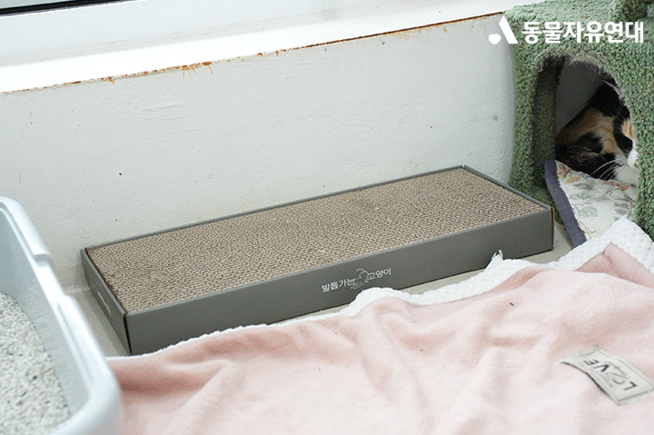 놓아둔 지 얼마 되지 않았는데도 여기저기 사용한 흔적이 가득할 만큼 고양이들이 좋아하는 스크래쳐! 새 스크래쳐를 신나게 사용하는 모습을 보면 활동가들도 미소가 절로 납니다.