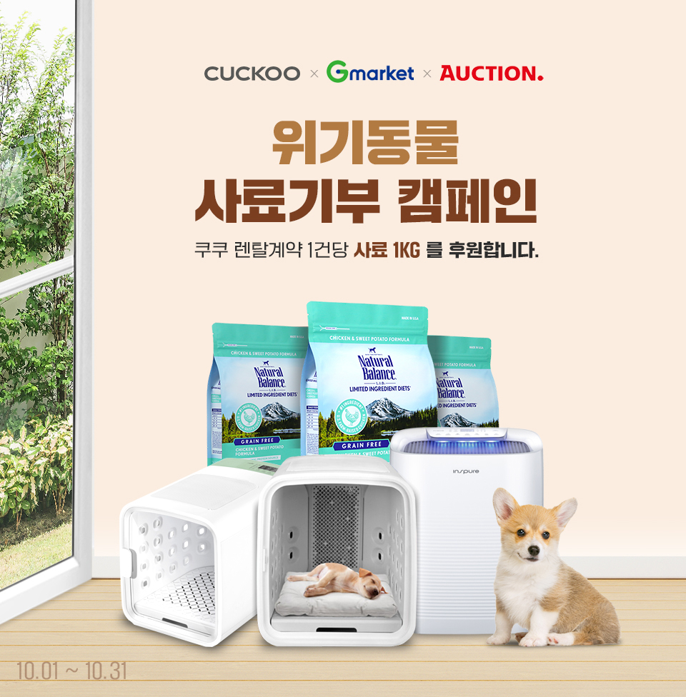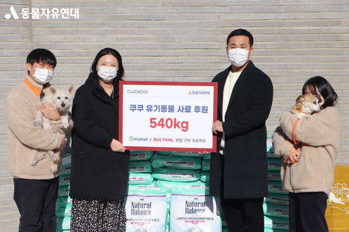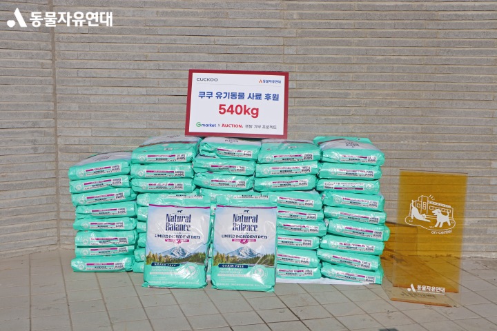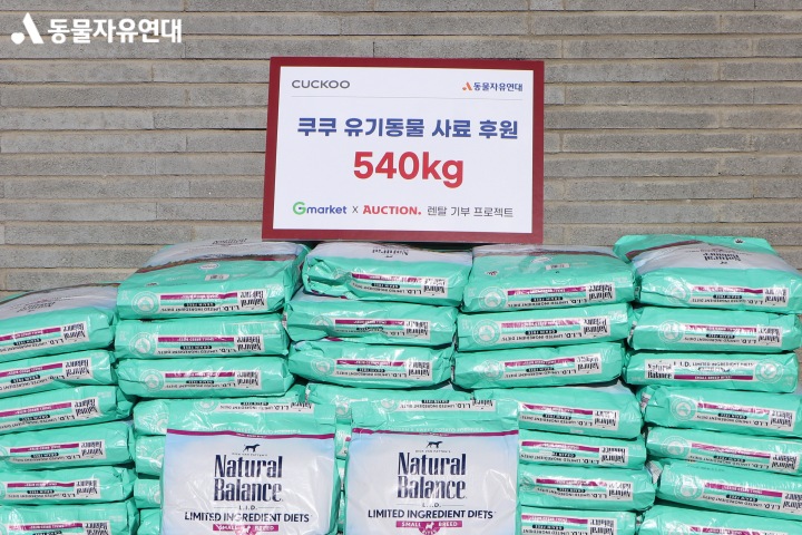 종합 건강 생활가전 기업 쿠쿠와 국내 대표 온라인 마켓플레이스 G마켓이 '렌탈 기부 프로젝트'를 통해 마련한 540kg의 내추럴발란스 사료를 기부해주셨습니다.