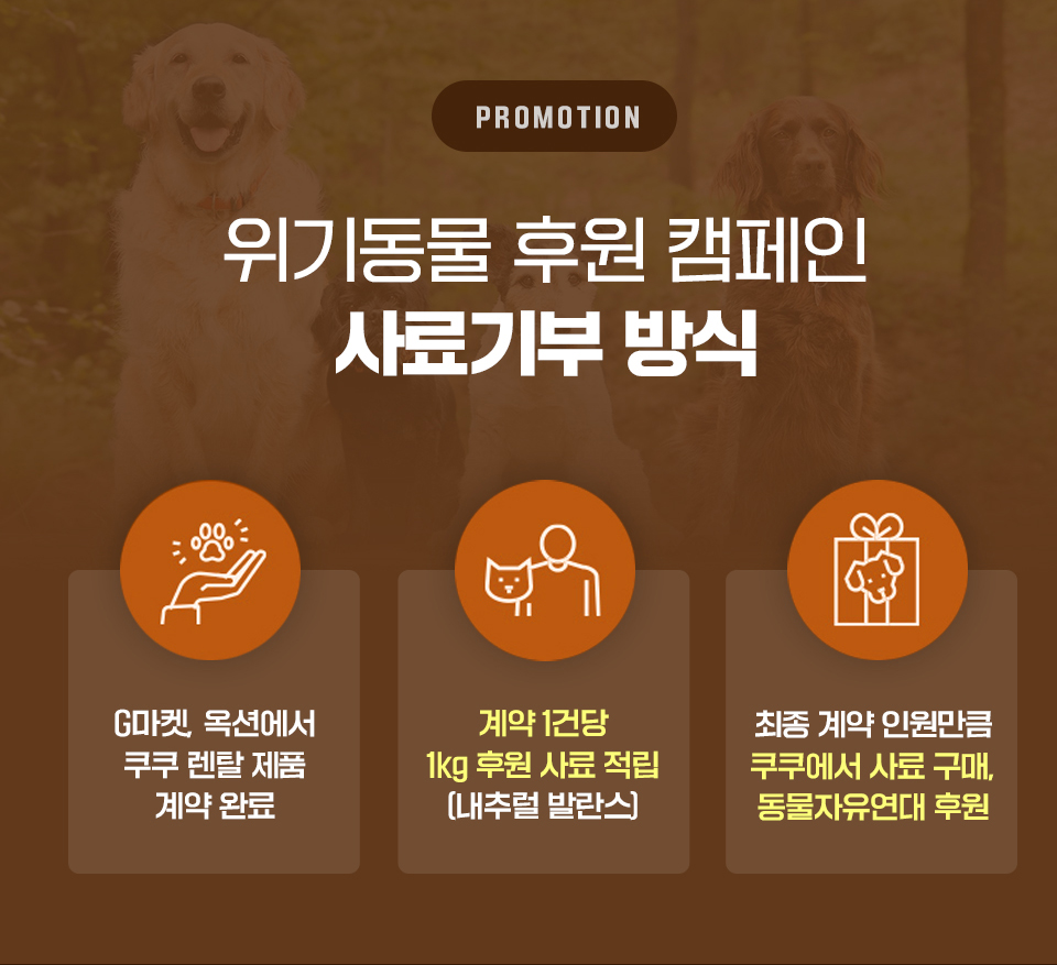 ‘렌탈 기부 프로젝트' 는 2022.10.1~2022.10.31 기간 G마켓/옥션에서 쿠쿠의 렌탈 제품 계약 1건당 1kg의 사료를 적립하는 형태로 진행된 캠페인입니다. 많은 고객분들의 관심과 참여로 총 540kg의 사료가 후원 될 수 있었습니다.