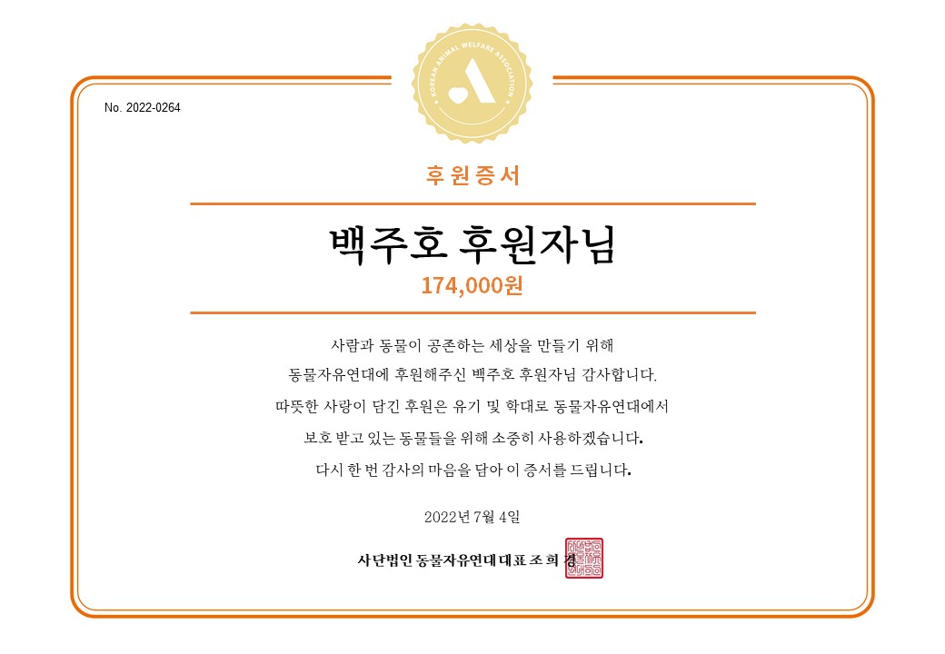 동물에게 더 나은 내일을 선물해주기 위해 선한 영향력을 행사해주셔서 감사드립니다.