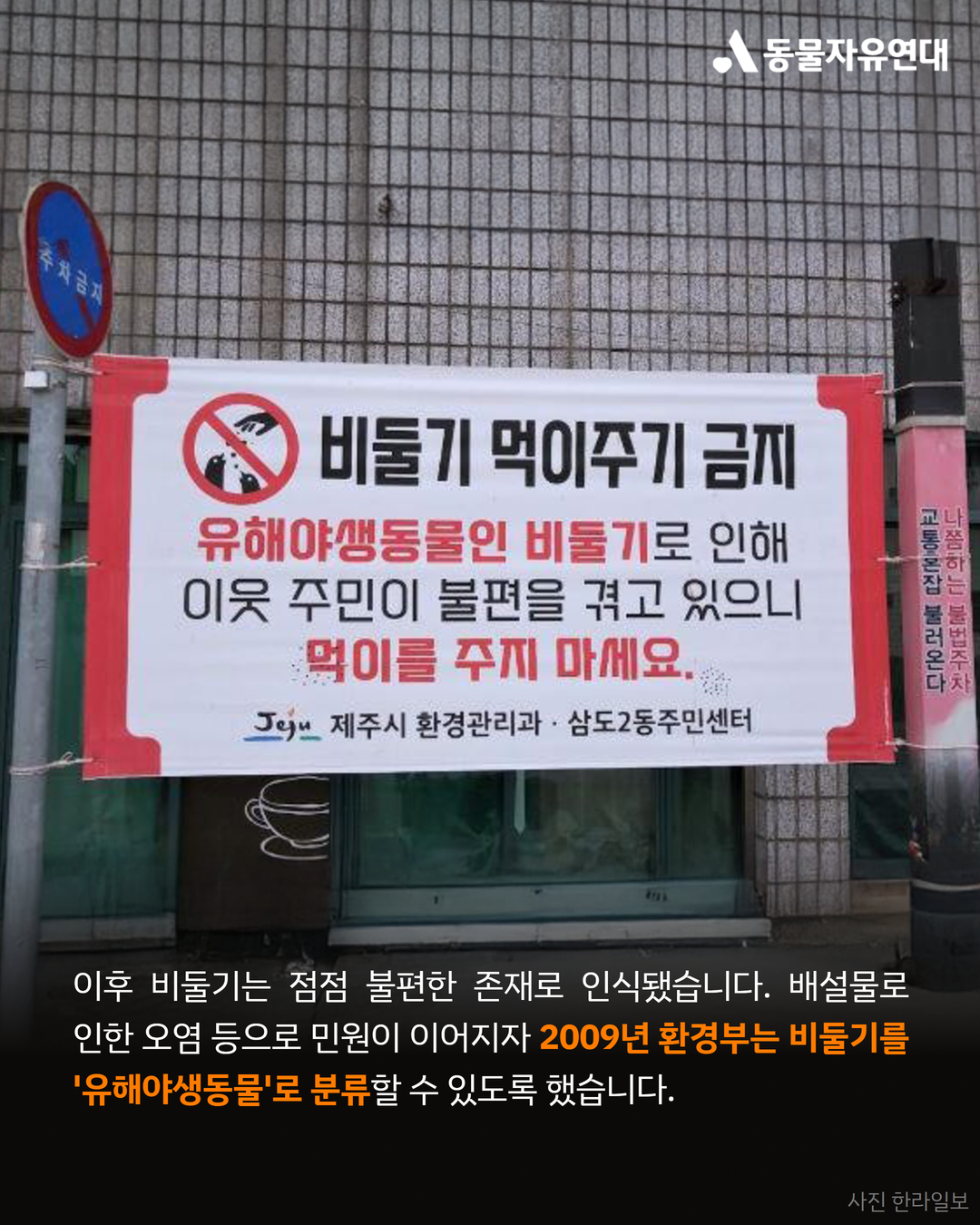 시간이 지나면서 도심의 비둘기는 불편한 존재로 인식되기 시작했습니다. 배설물로 인한 오염과 건물 부식 등으로 민원이 이어지자, 2009년 환경부는 비둘기를 ‘유해야생동물’로 분류할 수 있도록 했습니다.
