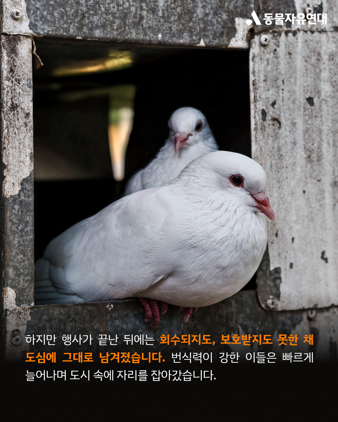 하지만 행사가 끝난 뒤에는 회수도, 보호도 없이 그대로 방사되어 도심에 남겨졌습니다. 번식력이 강한 비둘기들은 빠르게 늘어나며 도시에서 살아가게 됐습니다. 비둘기는 스스로 도시를 선택한 것이 아닙니다. 우리가 사용하고 방치한 뒤 도심 환경에 적응하며 살아남은 생명입니다.