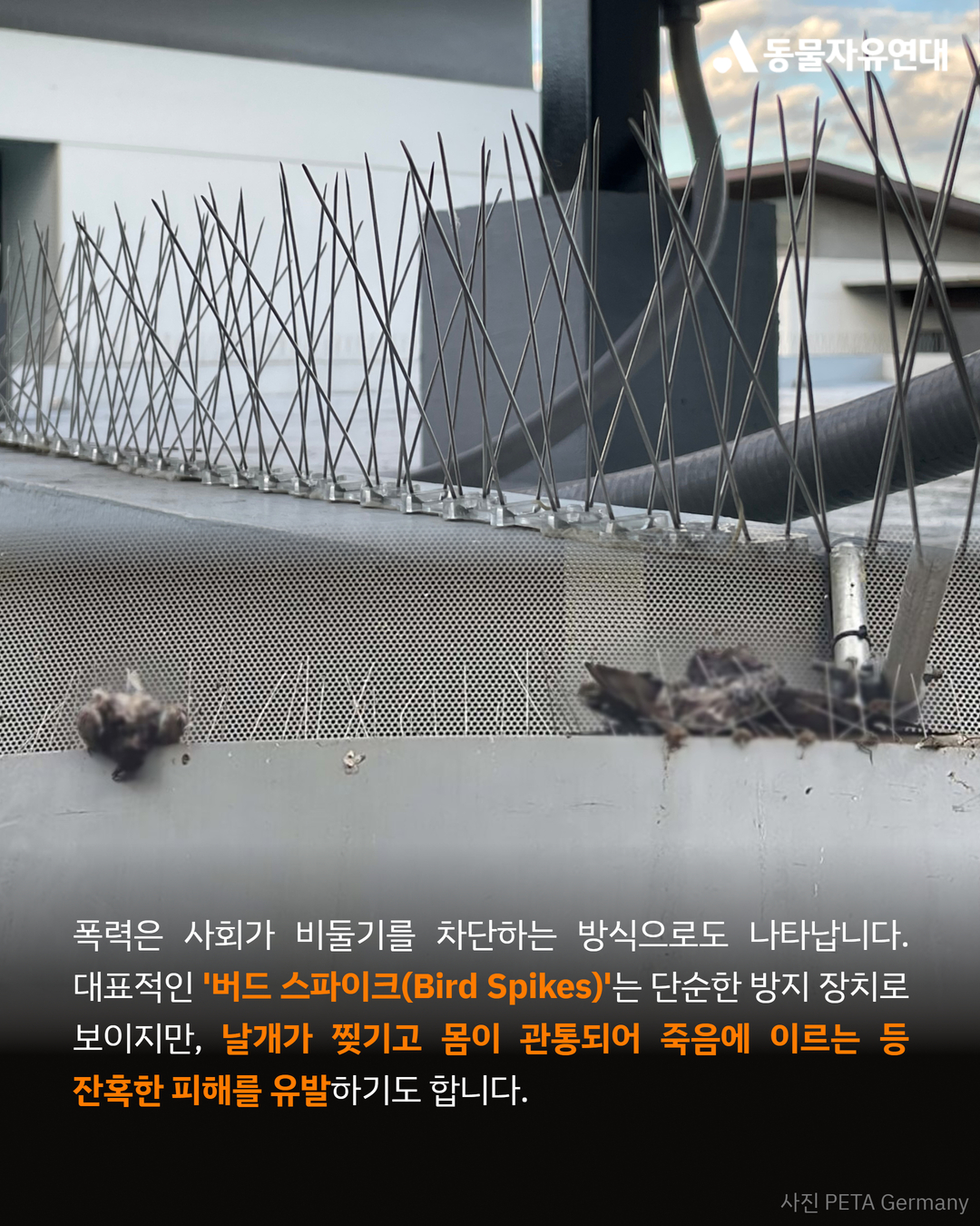 하지만 ‘간접 통제’라고 해서 모두 안전한 건 아닙니다. 대표적인 예 ‘버드 스파이크(Bird Spikes)’로 비둘기가 철침에 찔려 죽음에 이르기도 합니다. 보기엔 단순한 방지 장치 같지만, 실제로는 날개가 찢기고 몸이 관통되는 등 잔혹한 피해를 입히는 경우도 적지 않습니다.