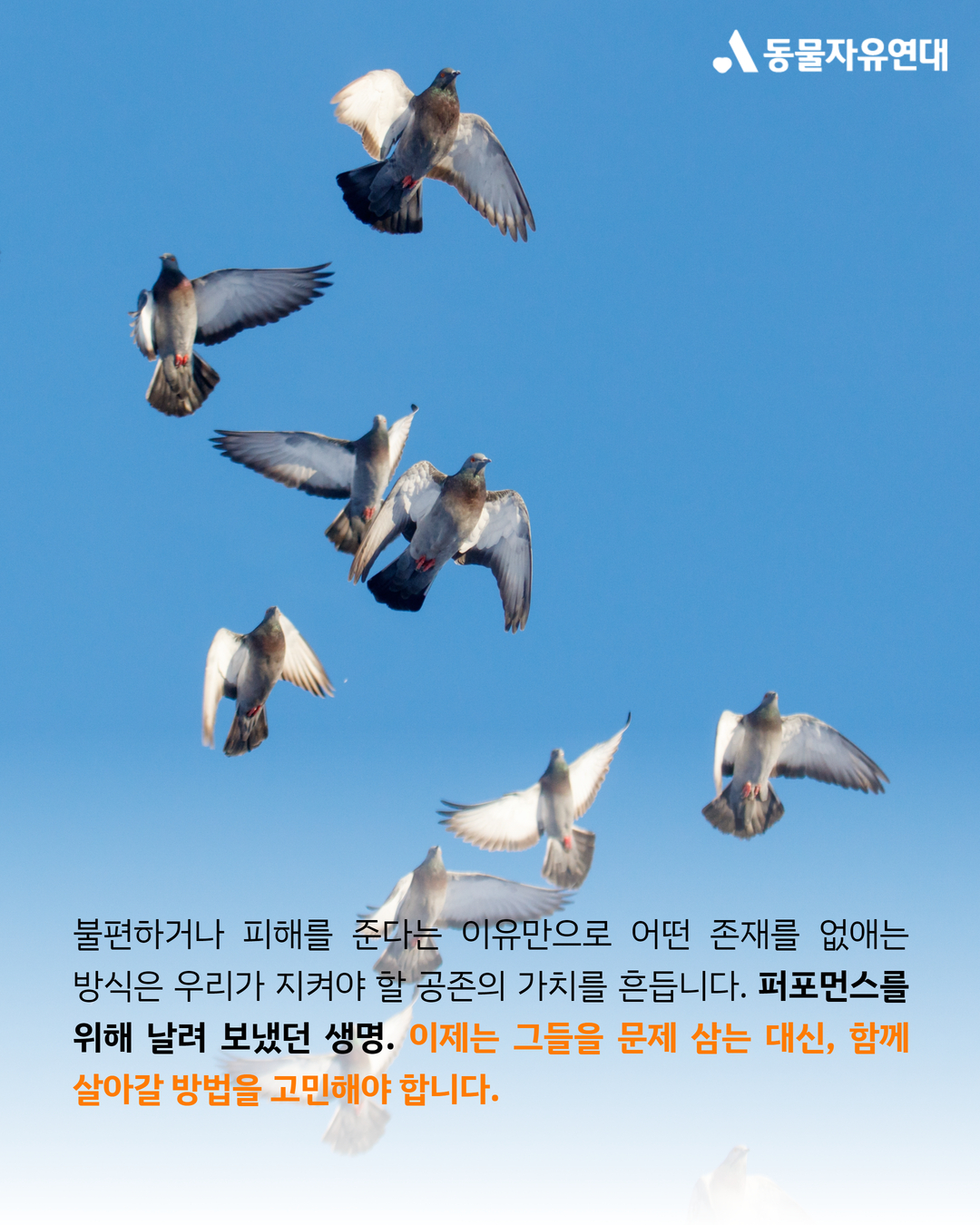 도시는 인간만을 위한 공간이 아니라, 다양한 생명들이 함께 살아가는 곳이어야 합니다. 불편하거나 피해를 준다는 이유만으로 어떤 존재를 없애는 방식은 우리가 지켜야 할 공존과 다양성의 가치를 위협합니다. 거리의 비둘기들도 우리가 책임져야 할 생명입니다. 한때 퍼포먼스를 위해 날려 보냈던 존재인 만큼, 이제는 그 이후에 생긴 문제에 대한 사회적 고민이 필요합니다.