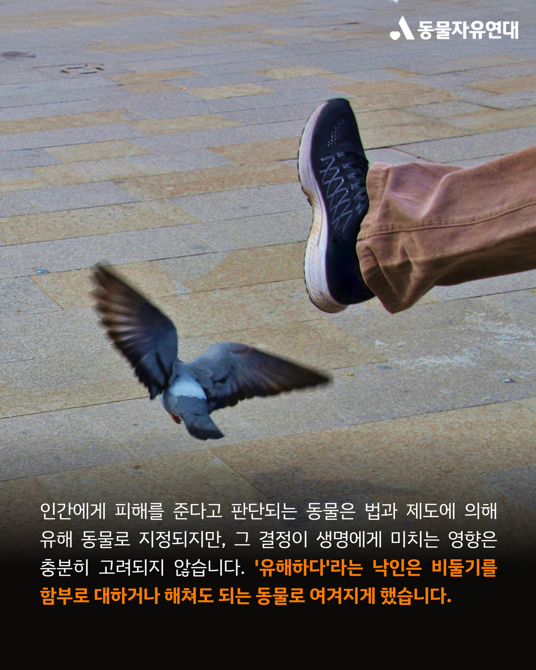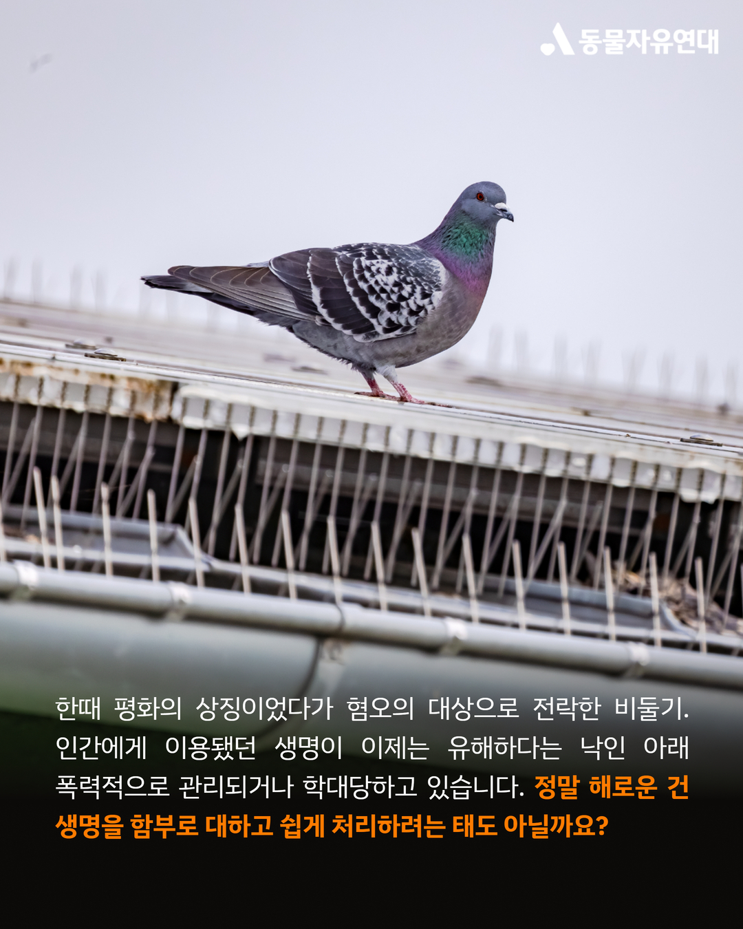 이렇게 인간에게 피해를 준다고 판단되는 동물은 법과 제도에 의해 유해동물로 손쉽게 지정됩니다. 그러나 그 결정이 생명에게 어떤 영향을 미치는지는 충분히 고려되지 않습니다. 유해동물로 지정되면 포획과 사살이 합법적으로 허용됩니다. 그 결과 이들은 ‘관리 대상’일 뿐, 존중해야 할 생명에서는 멀어집니다. ‘유해하다’는 낙인은 비둘기를 함부로 대하거나 해쳐도 되는 동물로 여겨지게 만들었습니다.