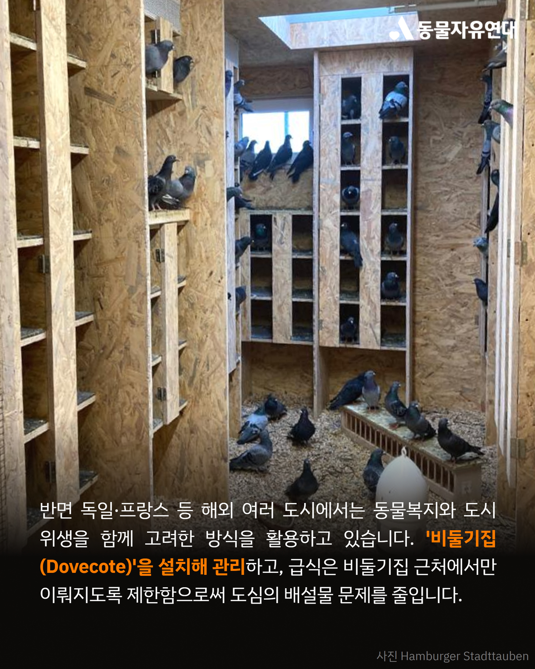 반면 해외 여러 도시에서는 동물복지와 도시 위생을 함께 고려한 방식으로 비둘기를 관리하고 있습니다. 스위스 바젤은 1988~1992년 ‘비둘기 집(Dovecote)’과 제한된 급식소를 통해 거리의 오염을 줄이고, 알은 가짜 알로 교체해 개체 수를 조절했습니다. 그 결과 4년 만에 비둘기 수가 절반 가까이 줄었습니다.