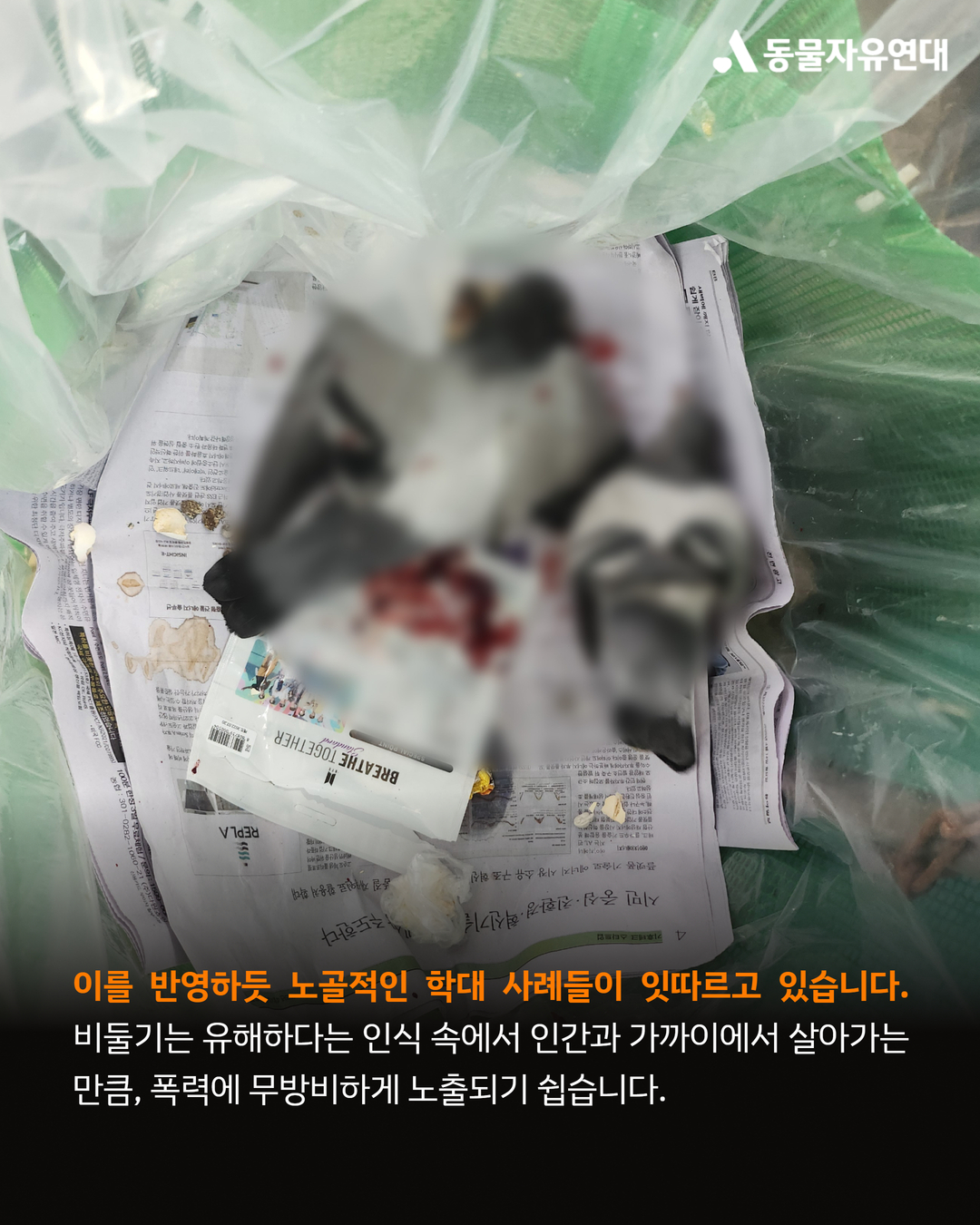 이를 반영하듯 최근에는 노골적인 학대 사례들이 잇따르고 있습니다. 지난 5월 서울의 한 지하철역에서 비둘기 두 마리가 새총에 맞아 죽었고, 작년 9월 SNS에는 비둘기를 발로 차는 장면에 ‘제기차기’라는 자막을 단 영상이 공유되기도 했습니다. 도심 한복판에서 인간과 가까이 살아가는 만큼 비둘기는 혐오의 대상이 되기 쉽고, 유해하다는 인식 속에서 폭력에 무방비하게 노출됩니다.
