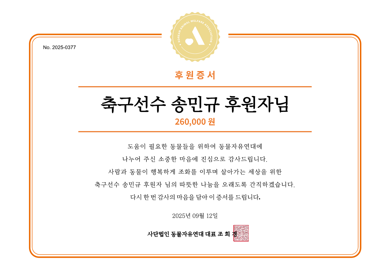 송민규 님의 생일 (09월12일)을 기념하여 후원해주셨습니다.